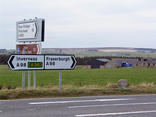 A milestone in granite unusually wide for its height and most unlike the standard turnpike stones of the area, it perhaps pre-dates them? Included in part for its cultural importance, to the confusion of recent residents and travellers it is still very much a reference point for giving directions. Even when it has not actually been in situ. It has recently been reinstated and concreted in after road-works and the staining on the stone shows the previous ground level that made it very unlikely to be seen from a car. Inscription reads Fraserburgh 10 3/4