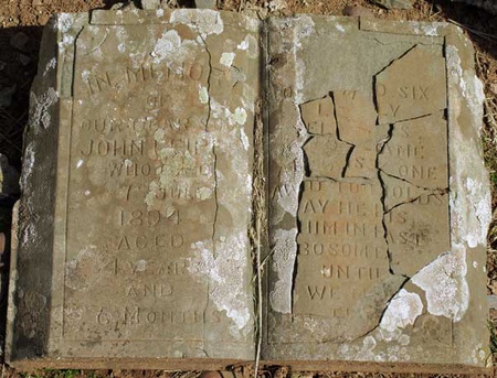 Example of a memorial in the popular book form, this one dated 1894 is in a permeable stone and has suffered badly from shell erosion over the years, it is in memory of a 4 years and 6 month old John Leiper. Who died on the 7th July 1894