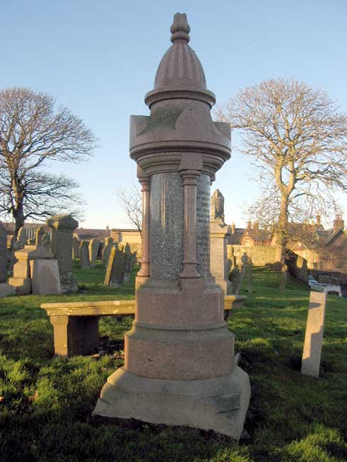 One of the photographs show 2 of the notable memorial slabs, one decorated with relief carved memento mori and two unusual figures, the other photographs show a grand Victorian/Edwardian monument in polished pink and grey granites to a "David Webster flax spinner in Bervie".