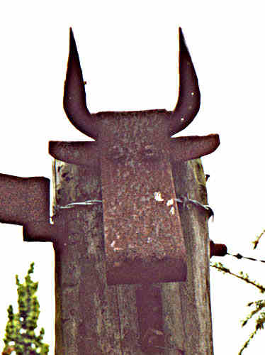 An assemblage by welding of old agricultural scrap. Although somewhat reminiscent of Pablo Picasso's treatment of the same subject using a bicycle saddle and handlebars, the different components create a more agrarian bull.