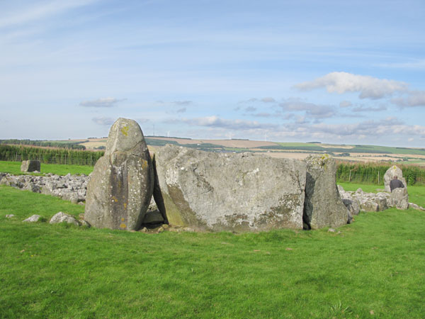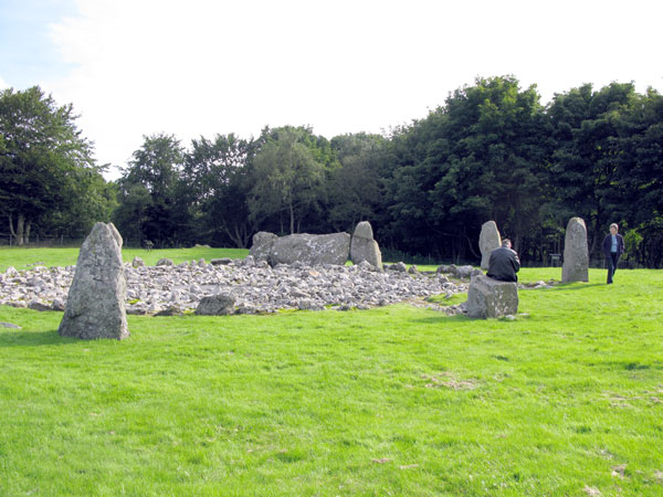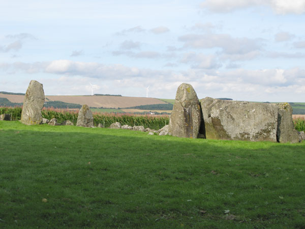 Recumbent stone circle containing a ring cairn with adjacent cremation cemetery. One of the stones, next to the flanker to the east of the recumbent, bears 12 cup marks. The stone circle precedes, in time, the cairn which covers cremations and the scattering of bone, flint and pottery. Excavation of the cairn showed use from the second to the first half of the first millennium B. C. . The adjacent Bronze Age cremation cemetry dates from circa 3500 years ago. At least 31 cremations and burials occured around a central pit, 8 of them children between 3 and 6. 11 deposits in urns have been found and 9 in pits some deposits containing several individuals. This place was used as a sacred site over an extended period of several thousands of years.