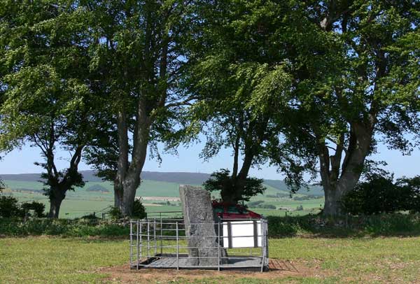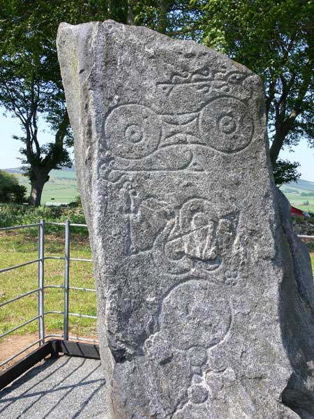Class 1 Grey Whinstone Pictish Symbol Stone, 201cm x 102cm x 60cm. Three carved symbols on the south face, from top: Double Disc and Z-rod; Snake and Z-rod and a mirror. The stone stands on its original site, a low cairn, which is in a fenced enclosure, in front of the stone was a grave, this association makes this stone important to those who support the theory of symbol stones as memorials to dead individuals.