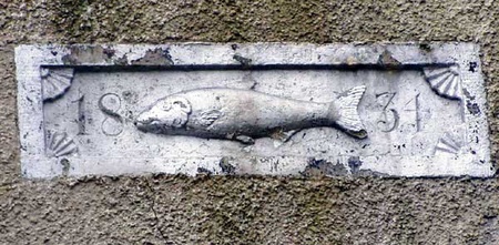 A carved painted datestone with a relief carved cock salmon between figures 18 and 34 within plain raised border with angle fluted 'fan' motif. The salmon is somehow more 'cuddly' than most representations of this popular subject
