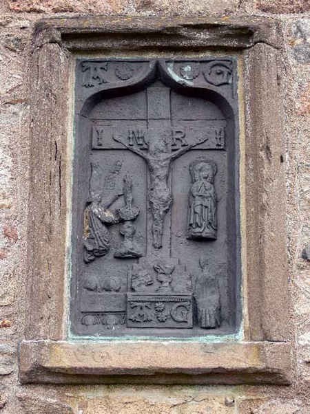 Bronze metal panel built into the north wall of Kinkell Church, showing the crucifixion, a figure of the Virgin Mary and an Angel.