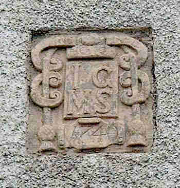 Listed Category B. Boyndie House 1740, an unusual house with a delicately shaped Dutch-gable, with two round eyes below the chimneys, and carved marriage stone as a shaped cartouche bearing the initials IG MS. Marriage stones appear to have been particularly popular in Banff. It was customary for the sons and daughters of town worthies to have an initialled datestone built into their houses in honour of their union.