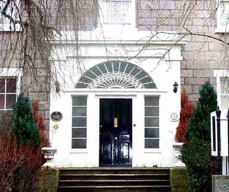 An elegant building, entered through a Regency pilastered porch with spreading fanlight, originally built for provost George Robinson when it was known as Moray House. There is also some excellent plaster work circa 1790's , the hall being a scaled down copy of the ante- room in Duff House.