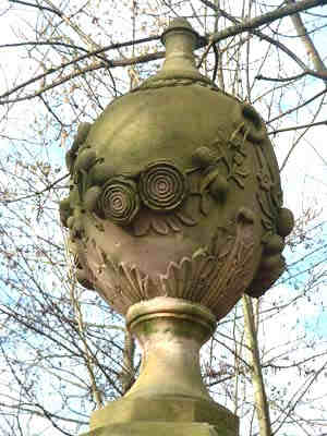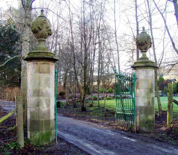 Pair of polished ashlar octagonal gate piers with moulded stepped caps supporting fine carved stone urns. Decorated with acanthus and swags of fruit and flowers. Gates probably made by the Banff Foundry (James Fraser) a firm which provided similar to other local country house estates, including Castle Fraser. House open to the public. See their website for details.