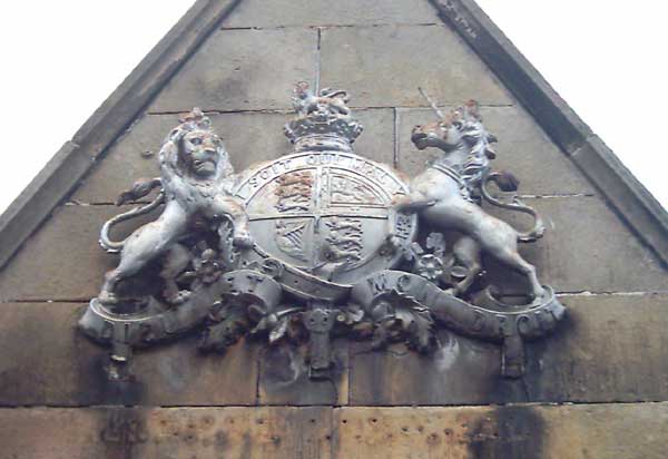 A standard issue 19th Century? cast metal 'UK Royal Arms', England, Scotland and Ireland (of a form first used from 1838) made by Walter Macfarlane & Co cast at the Saracen Foundry Glasgow. It originally adorned a 'public soup kitchen' at 21 High St. opened in 1887 to mark Queen Victoria's Jubilee, subsequently the building was the town's library (for man does not live by soup alone). The arms are of course displayed inverted (for Scotland) in Scotland the Unicorn of Scotland should be shown on the dexter side of the shield in England it is shown sinister. I do not of course know if this was the result of Victorian imperialist cultural insensitivity, bureaucratic ignorance or centralised mass production of soup kitchen décor.