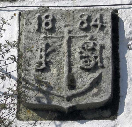 A shield shaped datestone decorated with an anchor and 2 monograms
