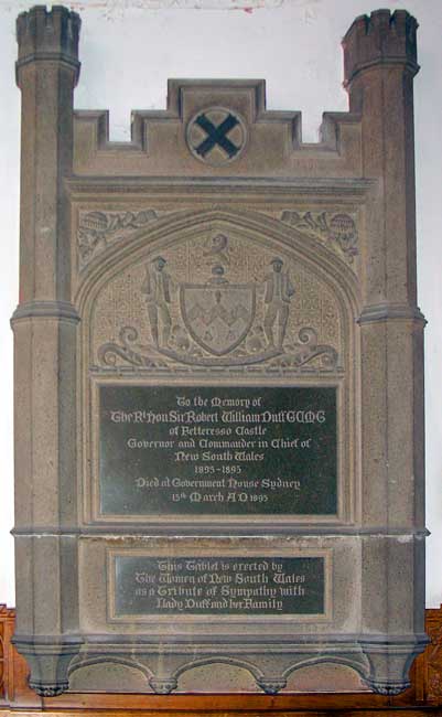 Relief carved stone panel in an architectural style with crenellated top and side columns, with armorial decoration, memorial to the Rt. Hon. Sir Robert William Duff of Fetteresso, Governor of New South Wales 1893-95. Presented by the 'women of New South Wales' as a tribute of sympathy to Lady Duff.