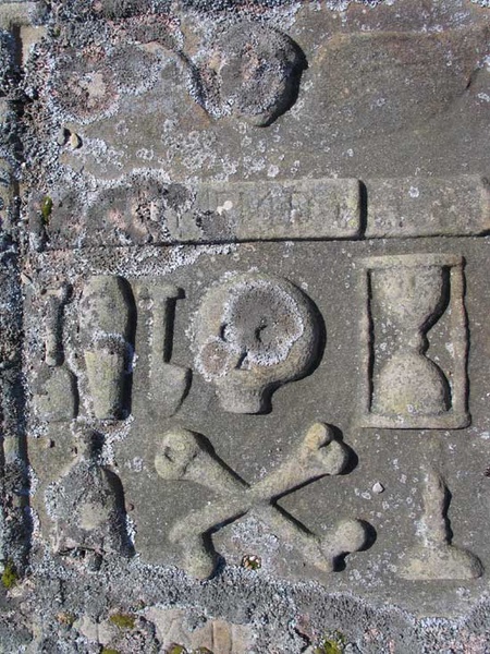 A stone slab carved with memento mori in a more primitive style than the nearby Clyne grave. The inscription is no longer legible.