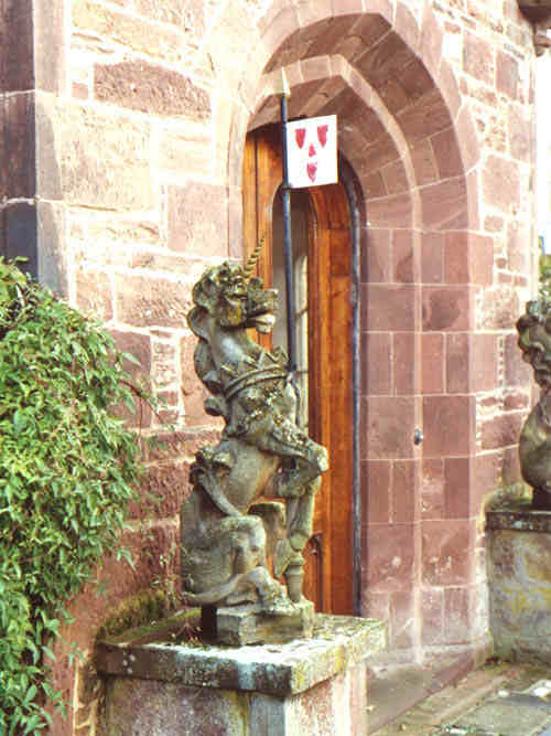 A pair of stone unicorns gaurding the main entrance of the castle. The late Captain Hay of Delgatie was an inveterate collector and the castle has many decorative elements that are now difficult to attribute to exact dates and provenances.