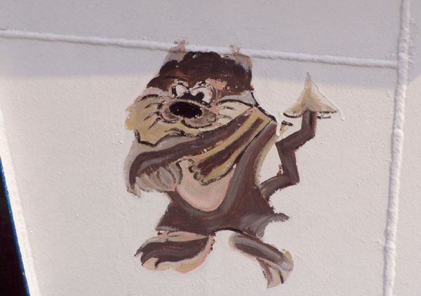 A painting of a Tasmanian Devil in the style of the well known cartoon character "Taz", It is obviously desired to keep the original rendering as it predates the last painting of the wheelhouse as indicated by some overpainting of the left leg.