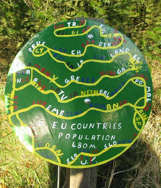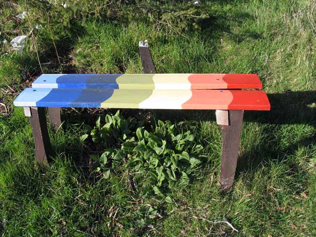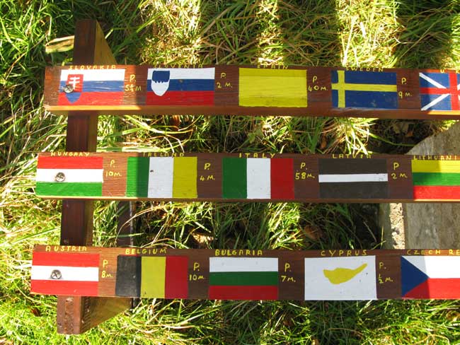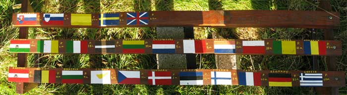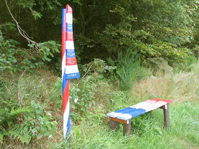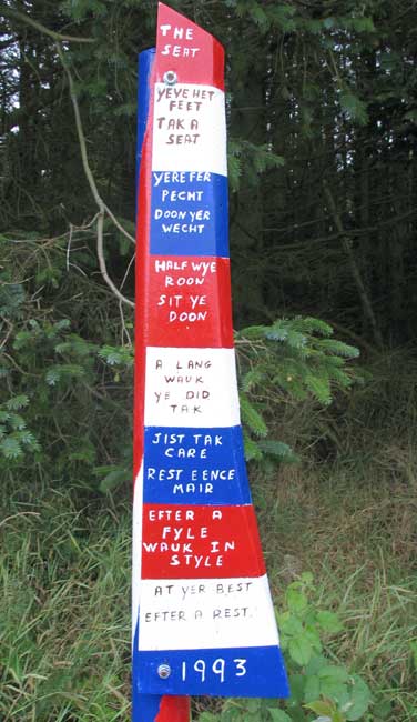 Top photographs show two benches one is a 'standard issue' park bench painted red the other assembled in situ and brightly painted with multi coloured wavy stripes, was the first installed, as of summer 2007 the red bench has been removed and the poem absent in the top 2 photos has been reinstated it reads: "The Seat. Yeve het feet, Tak a seat, Yere fer pecht, Doon yer wecht, Half wye roon, Sit ye doon, A lang wauk, Ye did tak, Jist tak care, Rest eence mair, Efter a fyle, Wauk in style, At yer best, Efter a rest. 1993" As of 2008 a second bench was re-installed, made of slats and painted with the flags of all the European Union states, with their respective population figures. Also added at this time was a tondo mounted on a post painted with what could be a conceptual representation of the EU with state names and the total population figure of 480 million in text.