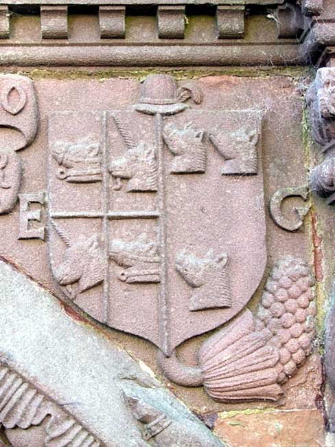 The charges on the shields show, heads of boars, unicorns and muzzled bears. The unicorns appear again at the top of the arch either side of the crown flanked by hounds hunting on the right a deer and on the left another animal I cannot definitely identify (perhaps a fox or martin).