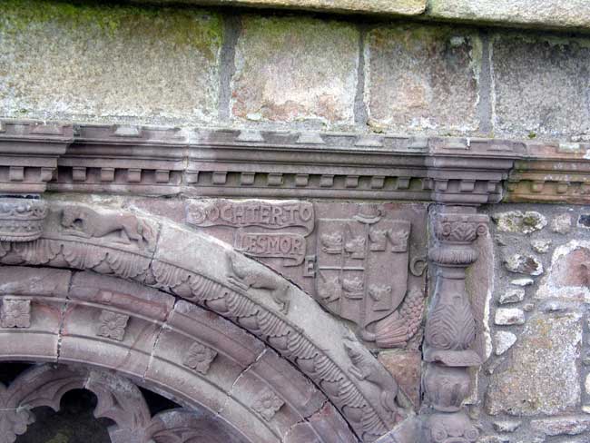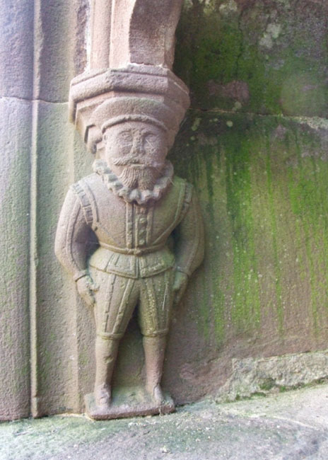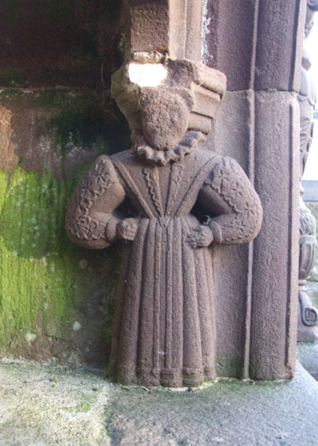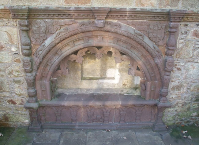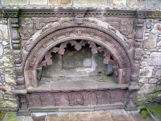 Tolquhon (perhaps to Forbes' design) and his wife Elizabeth Gordon, is supposed to be the relic of the S. aisle of the old kirk. Rich arched altar tomb mixed gothic and Renaissance motifs inspired by Dunbar tomb at St. Machar's, Cathedral.