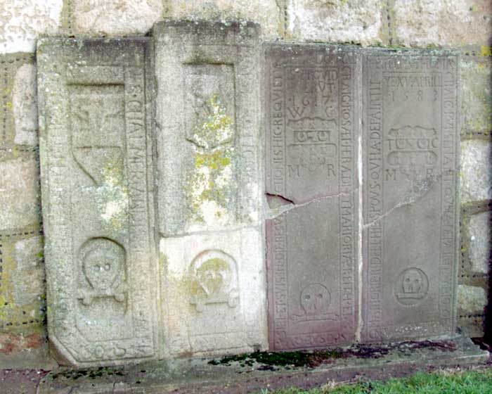 Four 17th century gravestones are set up against t he S wall of the present church.