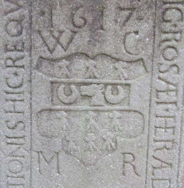 Other Tombstones : There are approximately 60 recumbent tombstones, one of which is significantly decorated. There are four, early and well carved, 17th/16th - century tombstones propped up against the S. façade.(see picture) There are many hundreds of upright tombstones dating from the early 18th -century, the most enchanting of which are to be found on the W. side of the yard - several being decorated with carved figures of children and popular phrases relating to death.