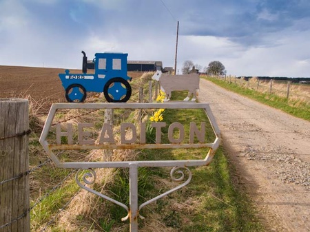 A modern steel sign this one avoids the nostalgic whimsy of some recent signs, in the old local tradition with naive cut-outs of a white-faced stirk and a tractor, it simply illustrates the farm's most important stock and equipment.
