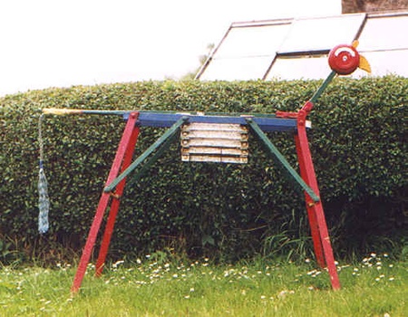 The original implement used to chop turnips for cattle feed has been given a dramatic new persona with some subtle welded and assembled additions and a paint job.