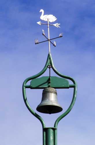 A combined seat, weather vane and bell mount, set on a cobble stone circle. The main frame in green painted tubular steel supports at its base a circular wooden seat and at its apex a bell surmounted by a weather vane in the shape of a swan.