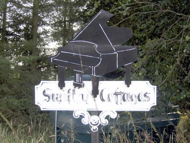 A painted plastic house sign of the 'guess who lives here sort', a more modern take on the local cut steel tradition, with a nicely foreshortened grand piano