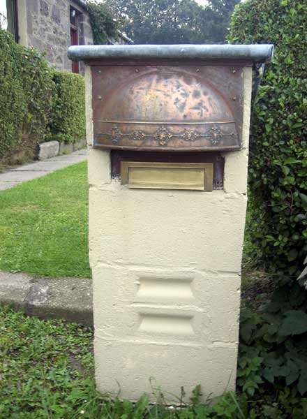 Masonry wood metal and slate house sign in the form of a miniature house with a block work postbox incorporating what looks like a copper fire-hood to protect the brass letterbox.