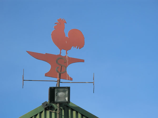 A weathervane that combines the traditional cock with an anvil leaving no doubt about the trade conducted in the premises below.