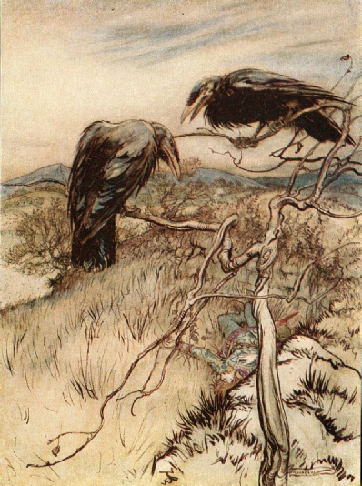 Jist imagine twa craws sittin on a tree an plannin their next meal. That's fit this sang's aboot. Ane o them his spotted a deid knicht lying ahin a dyke an tells the ither ane he'll mak a rare denner for them. They even describe the tastiest bitties tae eat first.