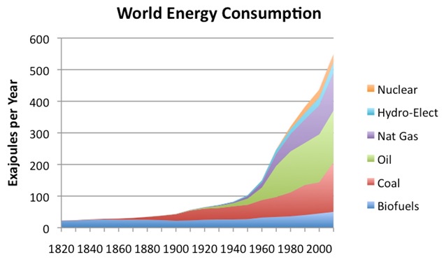Figure 1. World Energy Consumption by Source (based on Vaclav Smil estimates from Energy Transitions: History, Requirements and Prospects together with BP Statistical Data for 1965 and subsequent).