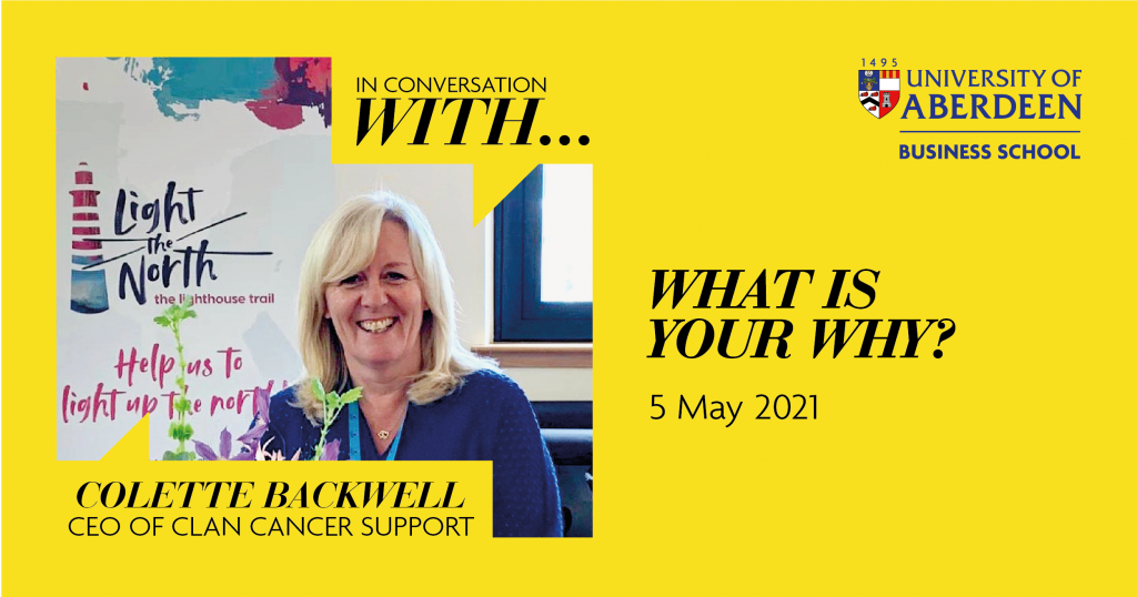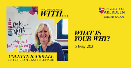 The inaugural event is with Colette Backwell, CEO of CLAN Cancer Support and will be hosted by Professor Martin Meyer, Dean and Head of Business School. Colette and Martin will discuss 'What is your why?'- finding your purpose, how you can make a difference to the people around you and the organisation you work for.
