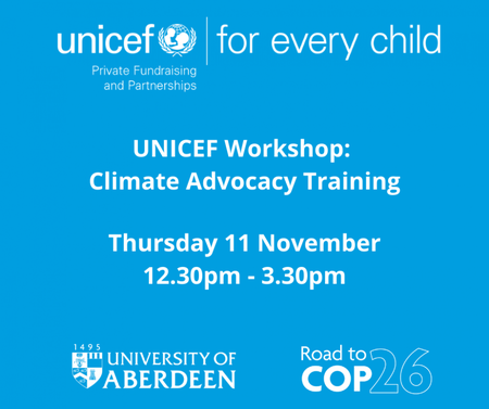 The UNICEF workshop on climate advocacy represents for the University of Aberdeen and its community an opportunity to train students and young people to be effective advocates, activists, and campaigners on important issues such as climate change. As a university we are committed to sustainability, as set out in the Aberdeen 2040 strategy and this workshop provides a platform to learn about advocacy and campaigning so that students have the opportunity to be skilled in this area.