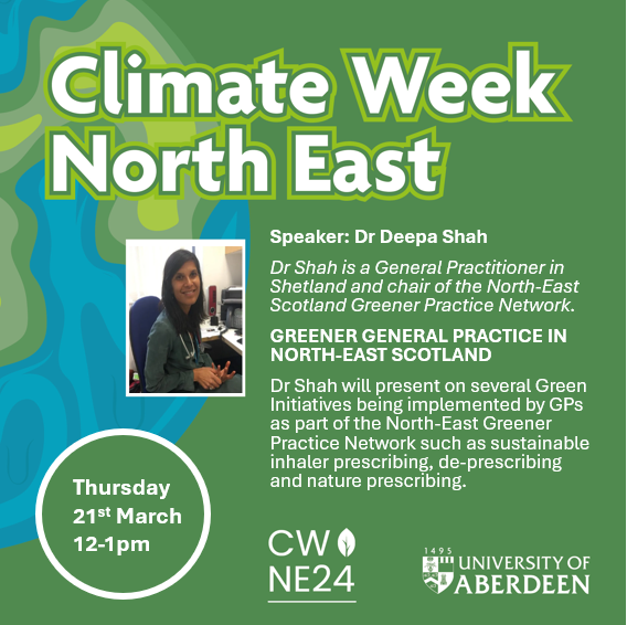 Dr Deepa Shah will present on several Green initiatives being implemented by GPs as part of the North-East Greener Practice Network such as sustainable inhaler prescribing, de-prescribing and nature prescribing.
