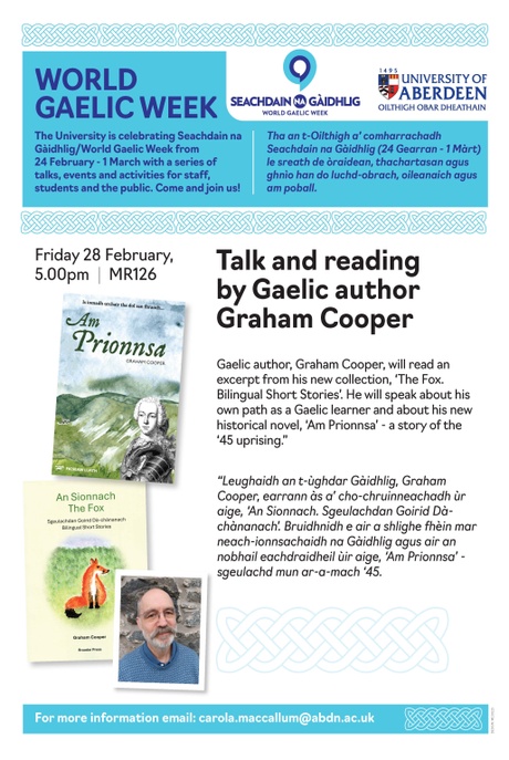 Gaelic author, Graham Cooper, will read an excerpt from his new collection, 'The Fox. Bilingual Short Stories'. He will speak about his own path as a Gaelic learner and about his new historical novel, 'Am Prionnsa' - a story of the '45 uprising."