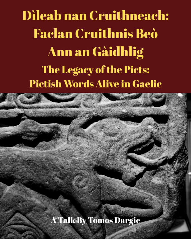 Although the Pictish Language is no longer spoken and almost forgotten, much of what has survived has been preserved in place-names and through words adopted into Gaelic from Pictish. In this talk, Tomos Dargie, a Postgrad student at Aberdeen University, discusses these survivals and what they can tell us about Pictish-Gaelic relations.