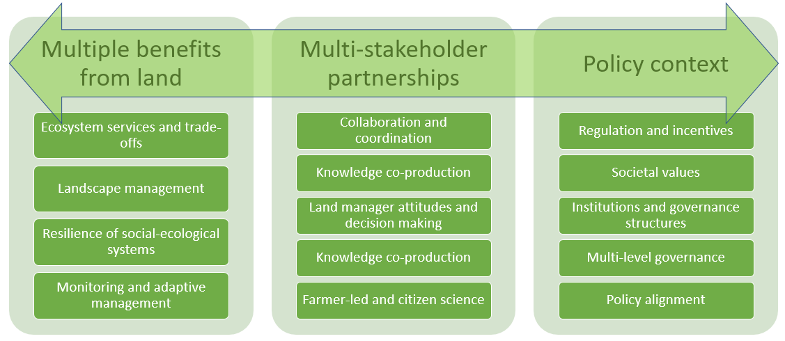 Food production is no longer solely about producing food of high quality in sufficient quantity, but also has to meet societal demand for reduced environmental impact. This theme focusses mainly on agricultural land use, but also encompasses other food sources such as game (e.g. deer). A key challenge is the trade-offs faced by different land managers such as farmers, foresters, or trusts in managing the landscape for multiple benefits including conservation, recreation, and food production. A range of social, economic, cultural, and political processes influence the management and governance of the landscape, and it is their interplay across different spatial, temporal and functional scales that is a key interest in this theme.