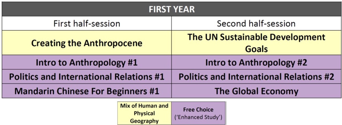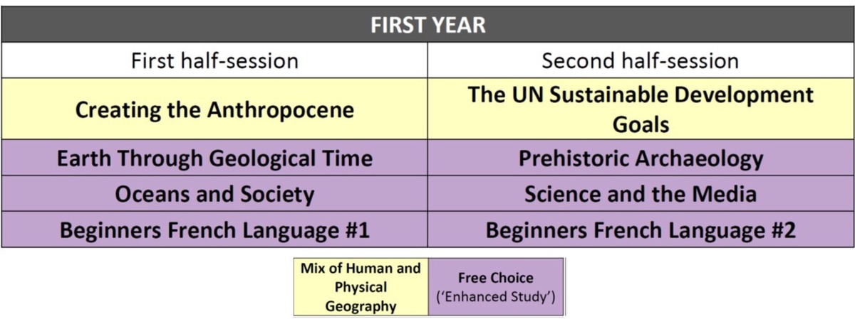 Complementing your Geography courses, you will also study six other courses during First Year in subjects outside Geography (this is called "Enhanced Study").