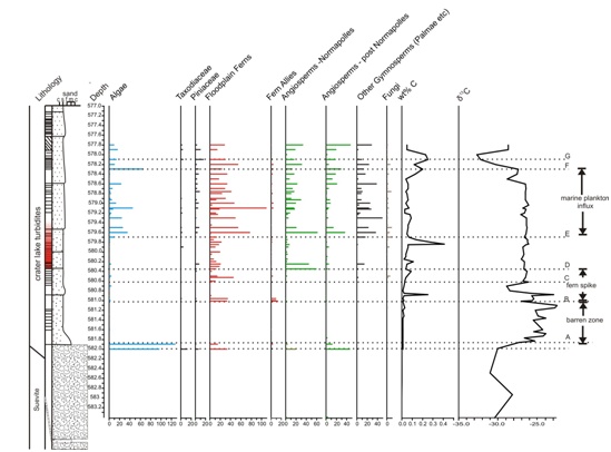 The bottom of the Boltysh core showing the rough lithology, palynological changes and d13C over the bottommost 6 m of the crater - fill. (Jolley et al. 2010). The 'fern spike' characteristic of aftermath of and initial recovery from the K/Pg extinction event is found just above a 0.9 m 'barren zone' devoid of any palynological content. |