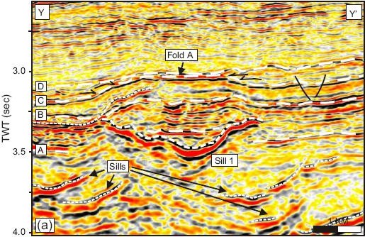 Illustrations of seismic-scale igneous (left) and sand intrusions (right).