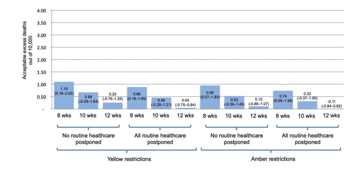 To show this, we compare the maximum number of excess deaths that would be accepted to introduce different lighter (but longer) lockdowns, compared to a strict circuit-breaker four-week very restrictive lockdown.