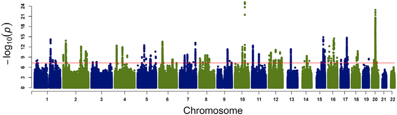 Figure 1. Map of Genome Associations with the Appendicular Muscle Mass in Humans. Significance level is presented on the vertical axis, while the chromosomal position of each genetic marker is shown on the horizontal axis. The red line across the plot represents the genome-wide threshold of significance (p < 5 x 10-8). This plot shows the association of variants with minor allele frequency >0.001 (Hernandez Cordero et al. 2019).