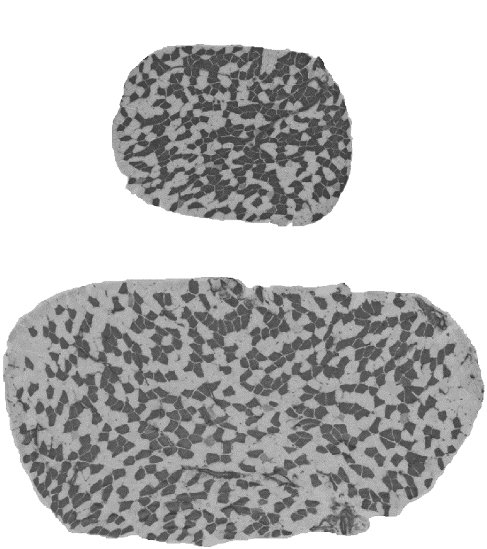 Figure 3. Cross-sections of soleus muscle from BEL (top image) and BEH (bottom image) strains. Samples were taken from male mice of the same age, subjected to ATPase staining following acid preincubation and imaged with 5X objective. Dark fibres are type I, pale fibres IIA. There are over 2-times more fibres and the fibres are over 2-times lager in the BEH strain soleus compared to BEL.