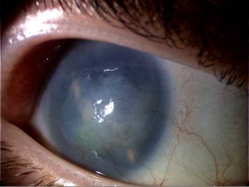 Figure 1: The eye of a PAX6+/- aniridic patient (photograph kindly provided by Dr K, Ramaesh, University of Edinburgh). Note the corneal opacity associated with vascularisation.