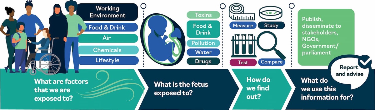 This infographic uses four key questions and their answers to help explain how environmental, and lifestyle factors impact human health and fetal development, as well as our process for gathering and using this information.