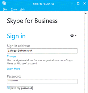 · Enter your email address in the format j.bloggs@abdn.ac.uk and your usual password, tick the Save my password checkbox, and click Sign In.