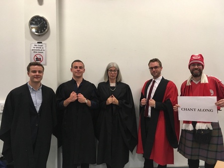 This year’s highly anticipated Staff v Student moot has been described as “the best in living memory”, “a night to remember”, and “what actually happened”, all at the same time. It is an event that showcases the pinnacle of student advocacy and legal skills against whatever the staff have dreamt up in nervous hours leading up to the annual showdown. Malcolm Combe (Staff v Student Moot 2011 survivor, bedecked in a kilt and a 1999/2000 Aberdeen FC home strip) and “fresher professor” Dr. Alisdair MacPherson entered the bear pit to defend ‘don’ pride and the construction of their new stadium at the leafy location of the Taylor Building, home of the Law School and the Law Library. Advocates and legal eagles Benjamin Jones and Neil Johnstone put up a strong fight in opposition, with Lady Anne-Michelle Slater presiding and "Moot of the Day" punditry being provided from the sidelines by Tom Mackie and Justine Weon.