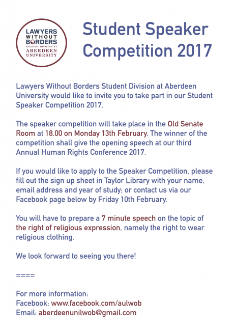 Lawyers Without Borders Student Division at Aberdeen University would like to invite you to take part in our Student Speaker Competition 2017.