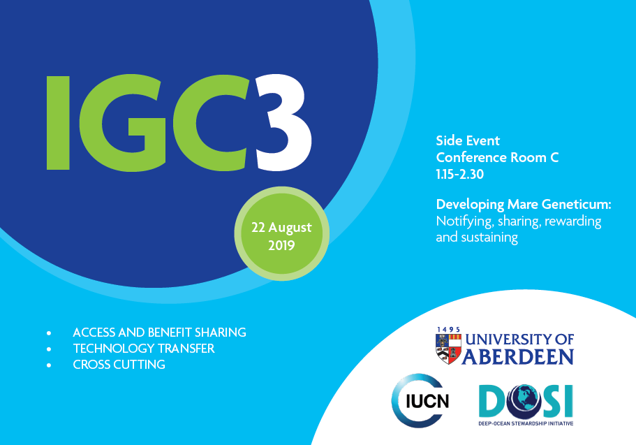 Working with the International Union for Conservation of Nature and the Deep Ocean Stewardship Initiative, we are holding a side event “Developing Mare Geneticum: notifying, sharing, rewarding and sustaining” at the third intergovernmental conference in New York on 22 August 2019. Mare Geneticum was developed by Professor Jaspars and other scientists, lawyers and policymakers as a pragmatic means of delivering access and benefit sharing in a way which is consistent with scientific best practice. A key element was prior notification of proposed cruises, the identification of results and the sharing of the results with all. Building on subsequent research, policy and scientific engagement and contributions through the BBNJ, this side event will explore how best to deliver an approach consistent with ecosystem governance, engagement with MGR in physical and information forms, how far down the supply and development chain requirements of benefit sharing should extend and in respect of what types of products, and the place if any of intellectual property rights and trade secrets in the negotiations.