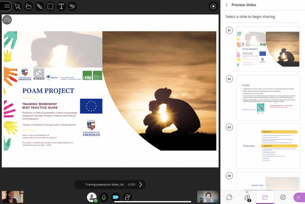 On 15 and 17 December 2020, Dr Katarina Trimmings and Dr Onyoja Momoh organised and delivered training at the UK Training workshop based on the POAM Best Practice Guide (“Protection of Abducting Mothers in Return Proceedings: Domestic Violence and Parental Child Abduction”) on the protection of abducting mothers in return proceedings involving allegations of domestic violence. This was the first opportunity to consider the newly published Guide on protective measures with a strong focus on the utility of the 1996 Hague Convention. Attendance at the workshop provided invaluable insight into the work of the POAM research project thus far, its findings, as well as the relevance of the Protection Measures Regulation in spite of the UK exit from the EU. The Best Practice Guide is aimed at ensuring that relevant professionals are trained in confronting issues around the protection of abducting mothers in child abductions committed against the background of domestic violence of the. An Executive Summary of the Guide is also available, as are further updates on the continuing work of POAM project on the website.