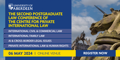 The Centre for Private International Law (CPIL) of the University of Aberdeen is pleased to announce that it is now accepting submissions for the 2nd Postgraduate Law Conference of the Centre for Private International Law which will take place online on 6 May 2024.